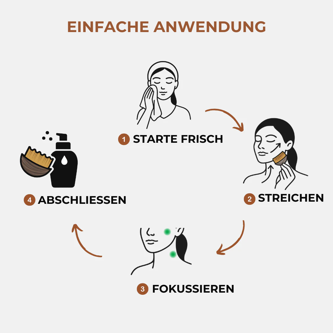 Schon wenige Minuten sanftes Bürsten pro Tag fördern die Durchblutung, reduzieren Schwellungen sofort und verbessern bei regelmässiger Anwendung den Teint, das Hautbild und die Ausstrahlung – ganz natürlich.